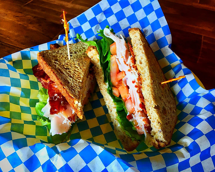 Full sandwich made with thinly sliced smoked turkey, local green leaf lettuce, juicy sliced tomatoes, sweet white onions and cold mayo on lightly toasted white bread. Served with a bottomless bowl of popcorn, a house-made pickle spear, and a bottomless beverage from our tea and lemonade fountain.
